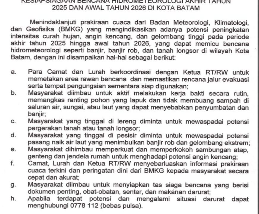 KESIAPSIAGAAN BENCANA HIDROMETEOROLOGI AKHIR TAHUN 2025 DAN AWAL TAHUN 2026 DI KOTA BATAM