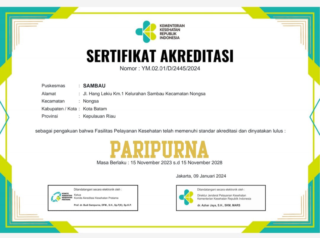 Puskesmas Sambau telah menjalani proses Re-Akreditasi pada 13 sampai 15 November 2023. Proses tersebut dibagi menjadi 3 tahapan. Setelah melalui proses re-akreditasi Puskesmas Sambau mendapatkan predikat “PARIPURNA” .