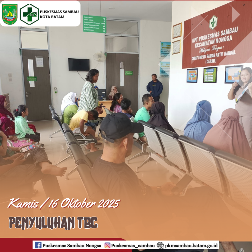 Pada hari Kamis / 16 Oktober 2025 dilaksanakan kegiatan penyuluhan dalam gedung tentang ” Penyakit Tuberkulosis “. Yang memberikan penyuluhan adalah dokter Agnes dengan sasaran yang di edukasi adalah seluruh pengunjung yang berada diruang tunggu puskesmas Sambau (lebih kurang 25 orang).