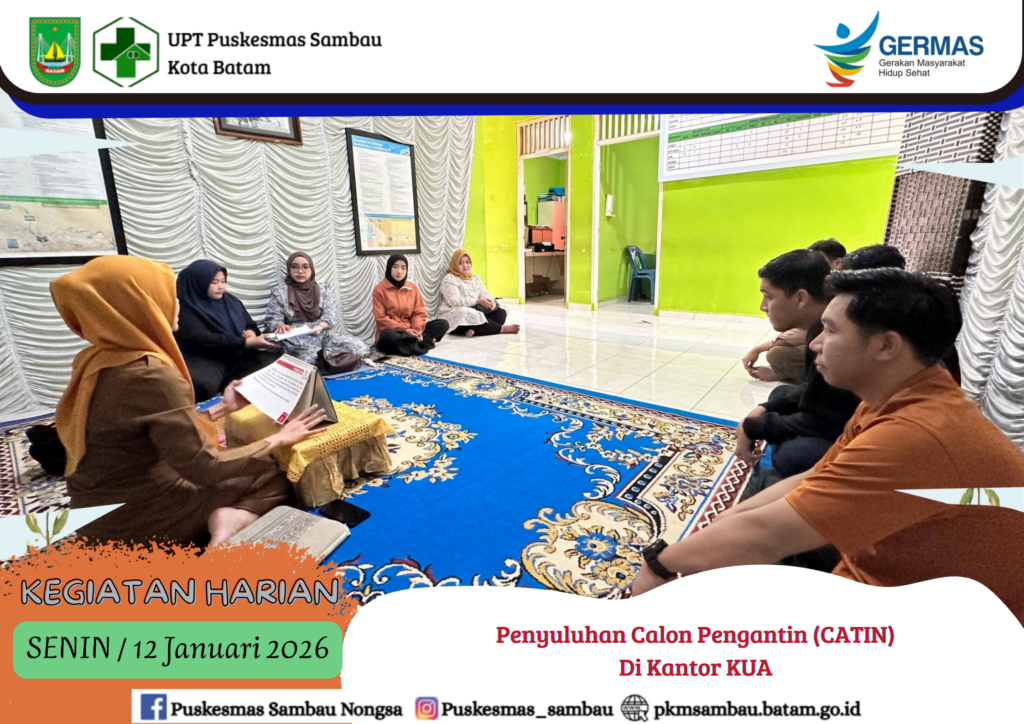 Edukasi Catin oleh petugas Puskesmas adalah program penyuluhan kesehatan komprehensif tentang persiapan pernikahan sehat, mencakup pemeriksaan kesehatan (fisik, lab, skrining IMS, imunisasi TT), konseling reproduksi, gizi seimbang (pentingnya tambah darah, pencegahan stunting), mental, serta perencanaan keluarga untuk membangun fondasi rumah tangga yang kuat dan berkualitas. Tujuannya agar catin memiliki bekal pengetahuan dan kesehatan untuk kehamilan sehat, menurunkan angka kematian ibu/bayi, dan mencegah stunting. Kegiatan ini dilakukan selama 2 hari pada tanggal 12 – 13 Januari 2026 dengan petugas dr. Revyda Mazaya dan Ibu Fitriyani Ramlan, S.Tr. Keb.